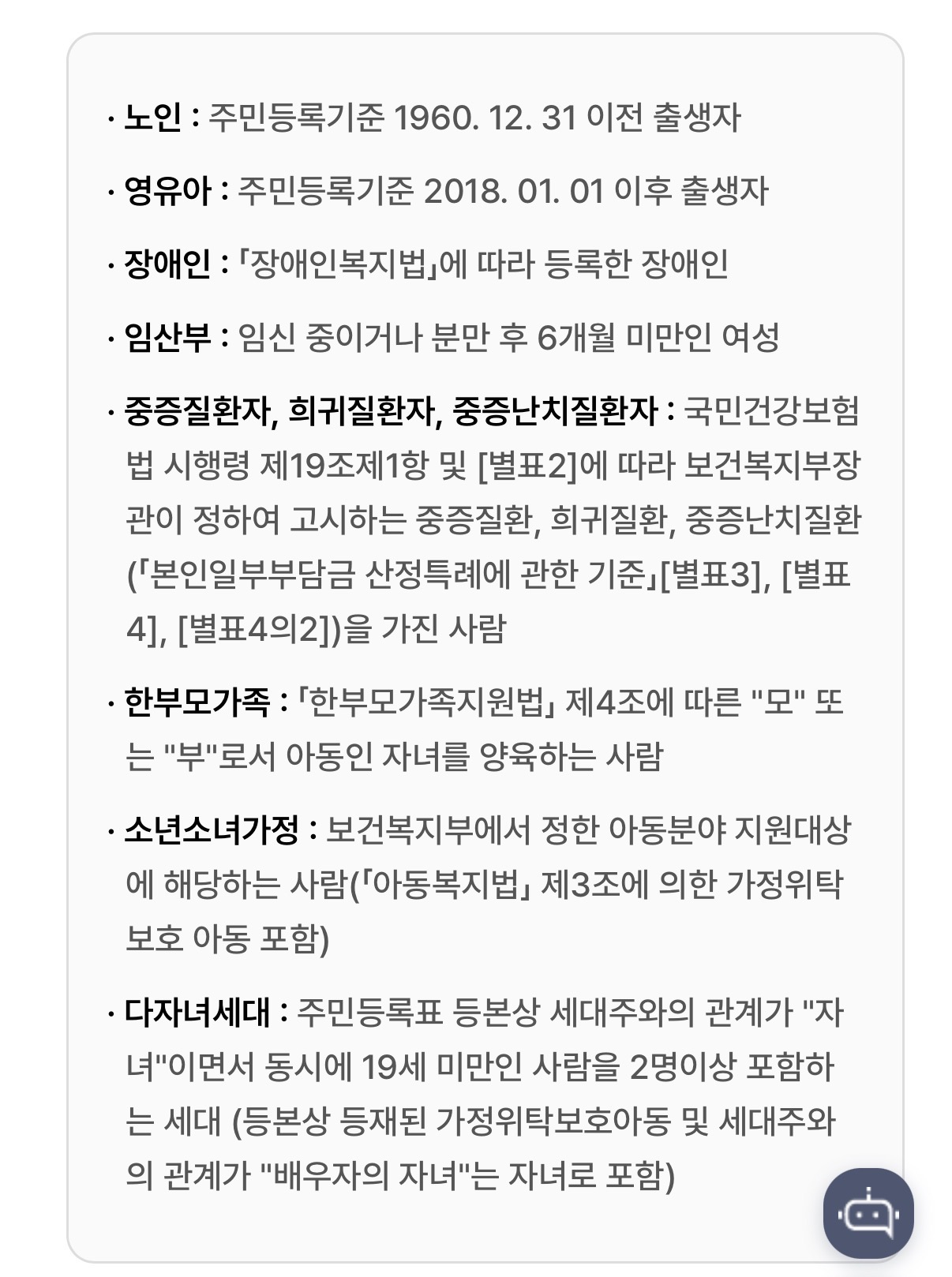(노인, 영유아, 장애인, 임산부, 중증질환자, 한부모가정)