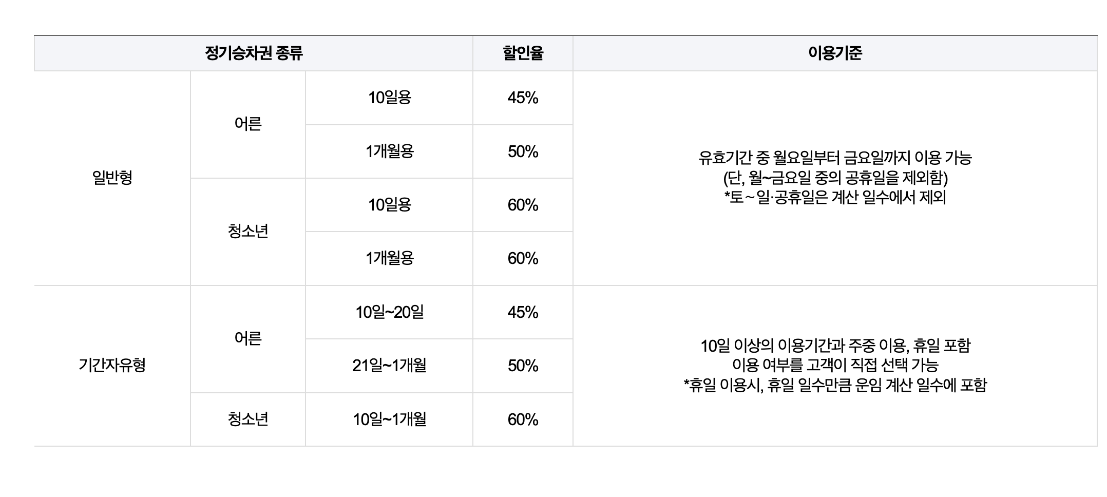 지정한 승차구간을 유효기간 동안 1일 2회(왕복) 이용 가능하며 45%~60%까지 운임 할인