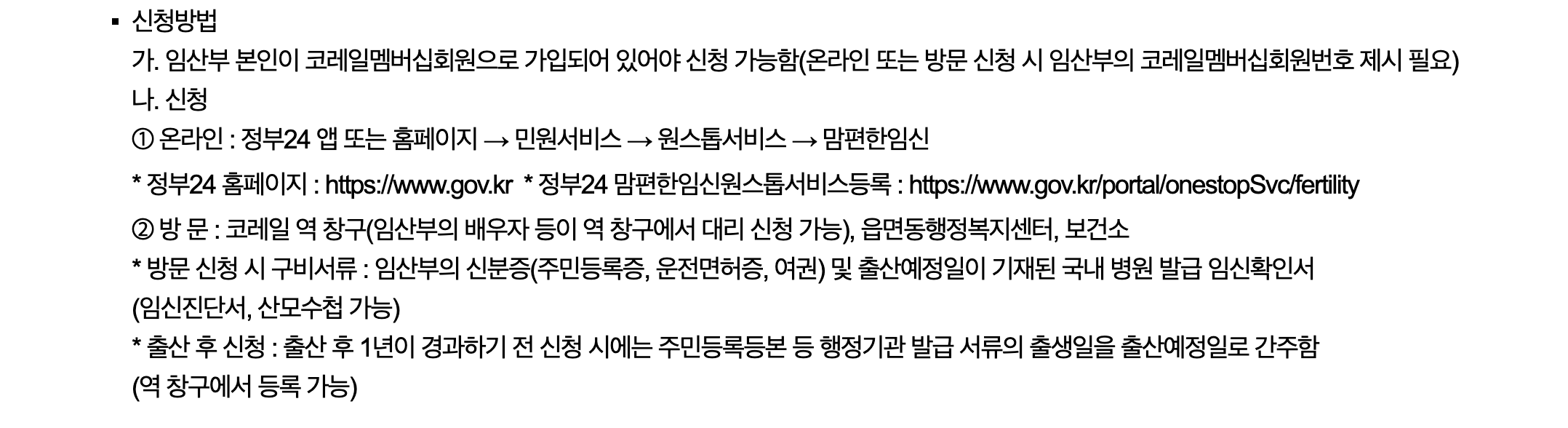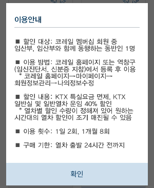 - 대상 : 코레일 멤버십 회원 중 임산부, 임산부와 함께 동행하는 동반인 1명
